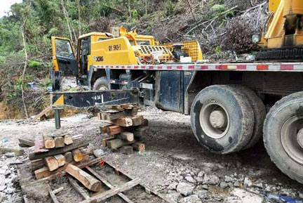 第三步:確認(rèn)吊車支腿安全,吊車支腿應(yīng)完全打開(kāi),支腿下方應(yīng)墊上枕木或鋼板。